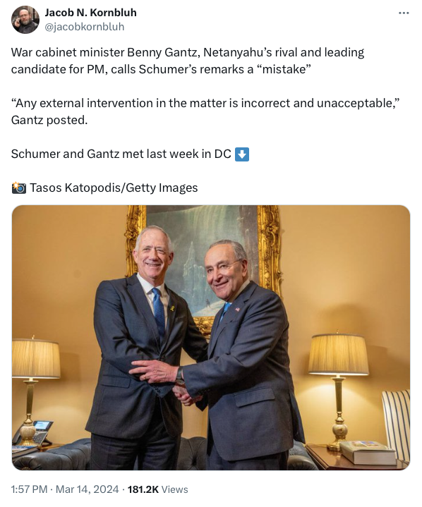 https://twitter.com/jacobkornbluh/status/1768335556512014358?ref_src=twsrc%5Etfw%7Ctwcamp%5Etweetembed%7Ctwterm%5E1768335556512014358%7Ctwgr%5E%7Ctwcon%5Es1_&ref_url=https%3A%2F%2Fredstate.com%2Fbonchie%2F2024%2F03%2F14%2Fisrael-fires-back-at-chuck-schumers-foreign-election-interference-and-tells-him-to-pound-sand-n2171381
