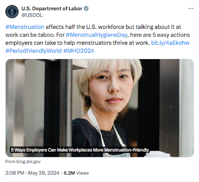 In a post on X, the DOL shared a link to a blog post about Menstrual Hygiene Day and five ways that employers can make their workplaces “menstruation friendly” for “menstruators.”