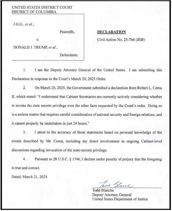 Judge Boasberg said: “By March 21, 2025, at 10:00 a.m., Defendants shall submit a sworn declaration by a person with direct involvement in the Cabinet-level discussions regarding invocation of the state-secrets privilege;”